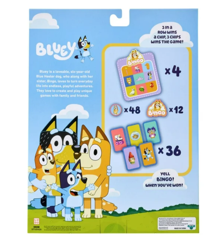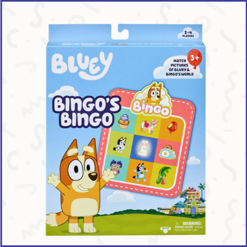 بنغو تطابق صور من Bluey ، عندما تتطابق صورة مع بطاقة البنغو الخاصة بك ، ضع شريحة Bingo فوقها. أول لاعب يحصل على ثلاث شرائح متتالية على بطاقته ويصرخ البنغو يفوز بالجولة وشريحة تسجيل. اربح ثلاث رقائق تسجيل وستفوز بلعبة البنغو. Bingo هي لعبة مثيرة وممتعة للاعبين إلى أربعة لاعبين.