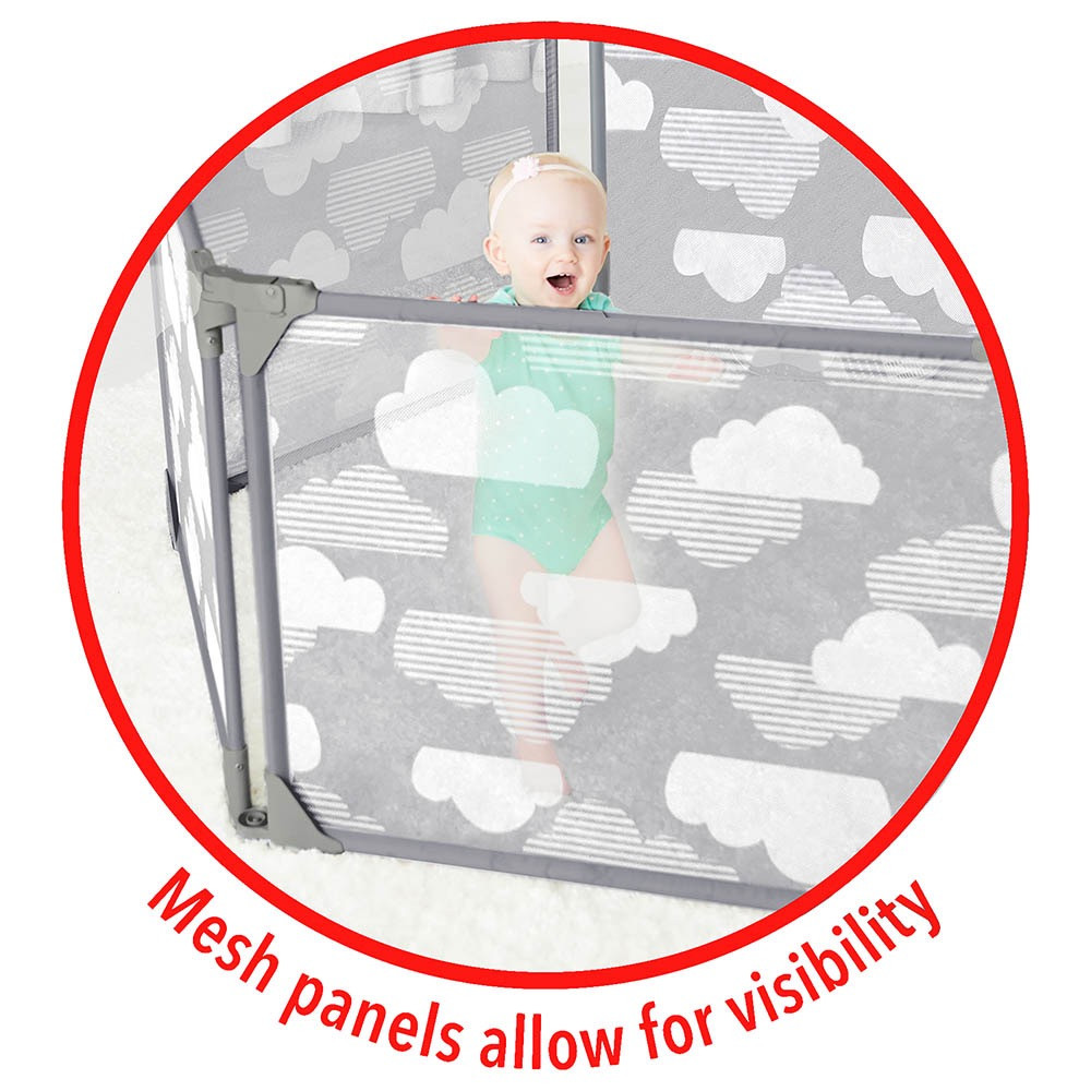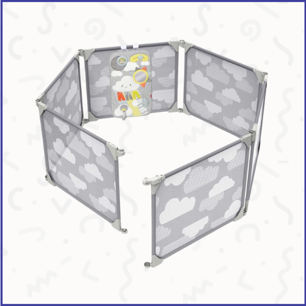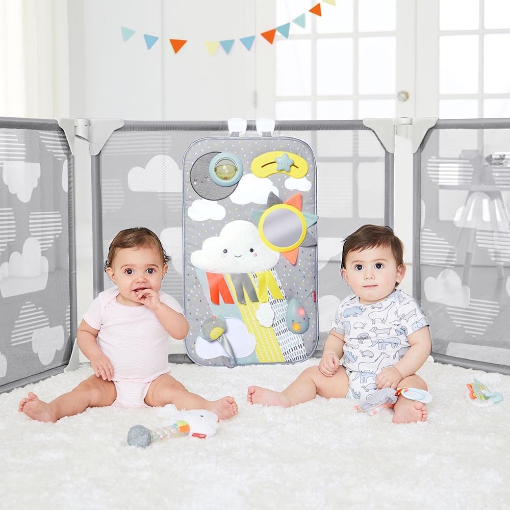 أرضية للعب مع خشخيشة خرزات ونجمة قابلة للتحرك وعضاضة على شكل غيمة ومرآة على شكل شمس وضوء على شكل نقاط مطر لعبة عصفور تغني ودمية محشوة على شكل غيمة مع شريط من الساتان